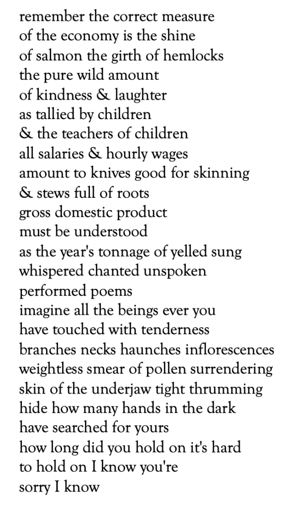 The poem explores the societal and semantic meanings of ‘value’, considering ‘salmon’, ‘hemlocks’, ‘stews’, ‘laughter’ as measures of economic viability. While climate economics and post-growth consider the relationship between finite resources and profit, do you feel there’s a greater urgency for a ‘tenderness’ towards the more-than-human?