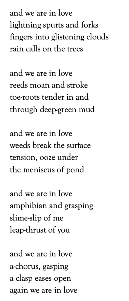 The speakers of the poem could be frogs, or another animals; this ambiguity is for the reader to resolve. I have been asking myself who gets to love, and asking why we hold to the binaries between you and me, human and other, natural and unnatural.