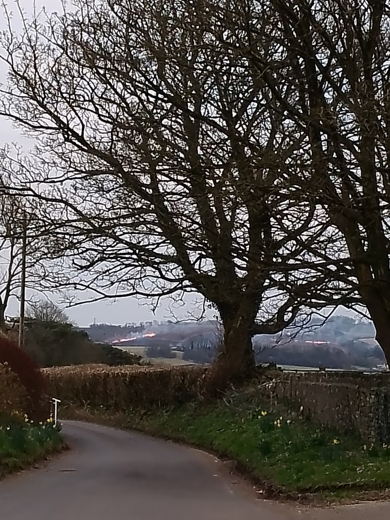 As I looked towards this hilltop, I could see black smoke rising from somewhere close to it, and then a flame. I thought perhaps a house, or a barn, or some other farm building was on fire. I went on walking along the bridle path, past the riding centre, with horses in the fields, and out onto the road that leads downhill back to our village. I could still see flames, and now they spread rapidly in a line of red along the top of Stalling Down, and on crests to left and right of it.