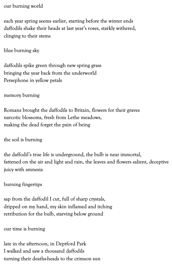 I wrote ‘daffodils, burning‘ in response to Wordsworth’s ‘I wandered lonely as a cloud‘, which projects joy onto to the flowers. The poem annoys me, but made me realise how little I knew about daffodils. I didn’t know that they are native to the Iberian peninsula or that the Romans brought them to Britain, and while I have a strong sensory memory of my sticky irritated fingers holding freshly-cut blooms, I didn’t know why. But they seem everywhere in spring and my memory juxtaposed the daffodils in my local park with the withered roses on a nearby wall, something I wouldn’t have seen 20 years ago, before climate change extended autumn and spring into winter. Spring and graveyards suggested resurrection, and I wondered what it would be like to be a bulb spending most of the year in some analogue of sleep, sustained by the products of spring photosynthesis, and burning predatory mouths with sap full of tiny crystal blades.