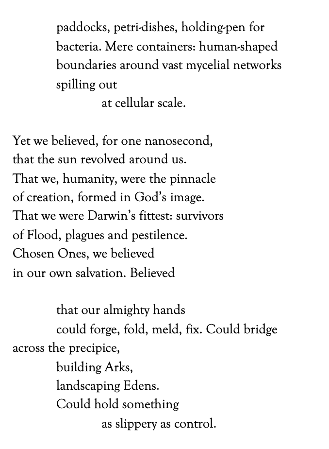 I attempted to portray this by showing the natural world expanding both outwards and inwards. We can zoom out into space and see that earth is just a pinprick, and we can also zoom in with a microscope and find just as much vastness in the other direction – when we think of cells and atoms, and also when we consider networks of bacteria and mycelium. As the poem progresses, the stanzas which hug the left of the page are human-centric and describe our religions, power structures, and scientific achievements (all futile attempts to keep a grip on things), while the alternate stanzas (which are also less ‘fixed’ on the left of the page) portray more of the non-human world. The intention here is to contrast how much we think we know with how little we do know in reality, and ultimately to show that the non-human world is far more ‘in control’ than we will ever be.