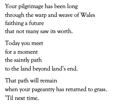 Though bleak, especially in the final stanza, there is hope buried within. Interpreting Aled’s writing, the pilgrimage through the ‘warp and weave of Wales’ is part of ‘faithing a future’ – one that is ultimately better. Why? Because our interaction with nature communes with pre-existent lore and sacredness fostered through our predecessors. It is a kind of natural sanctity that cannot be replicated. Therefore, our future lies in the natural world. The stories, legends, and myths that sacralised Wales still live and shape us, and quite literally live in the land, with Ynys Enlli being rumoured to have 20,000 saints buried in its soil. But those who call Wales home today can add new values and stories into the land for future generations to be inspired by. Biblically, we are assured that nature will be the proxy through which humanity is restored: